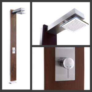 In legno tropicale e acciaio Inox AISI 316 satinato, con miscelatore per il controllo della temperatura dell’acqua.