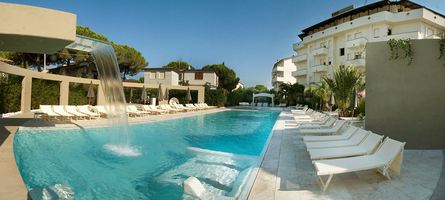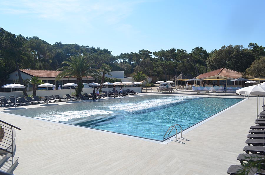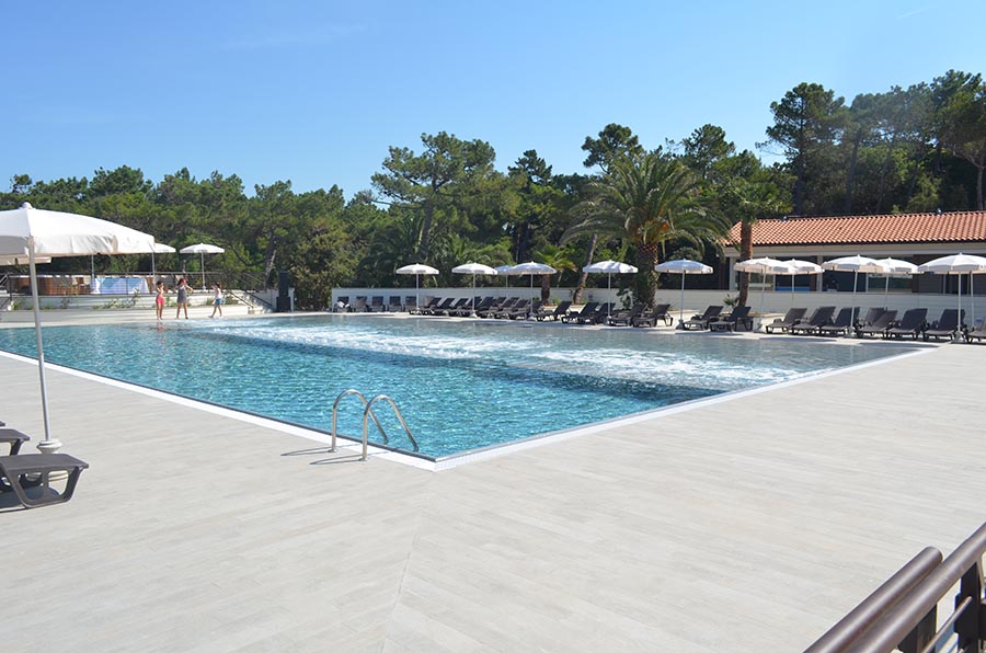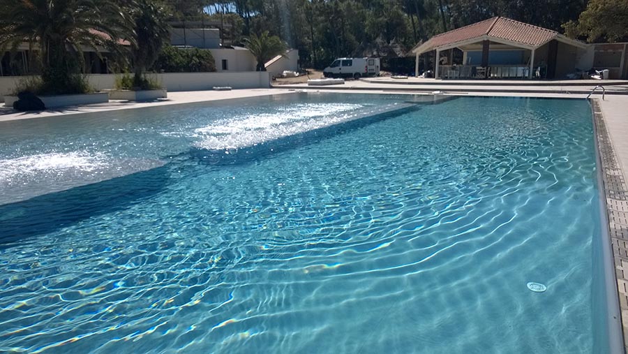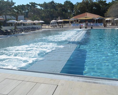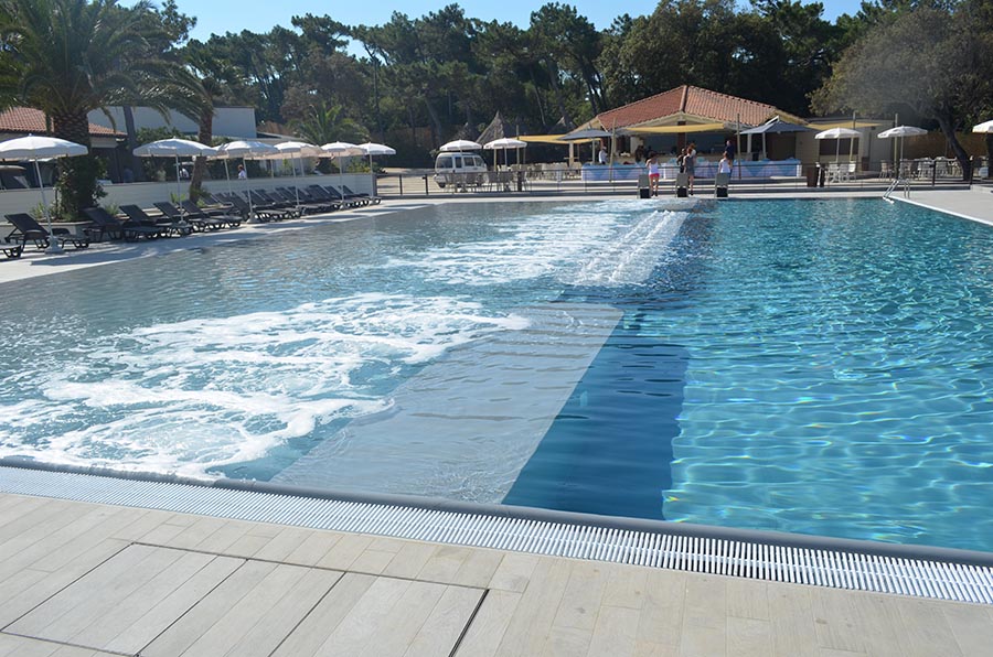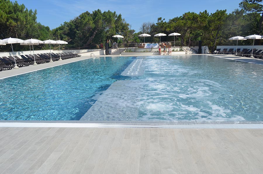 Abbiamo diviso la vasca di 400 mq in tre settori: un tratto di 25 x 6 metri e profondo 140 cm per il nuoto e le attività sportive; un tratto per l’idromassaggio ed il relax con isolotti prendisole; una grande riviera che abbiamo progettato prevedendo un rivestimento con un tappetino soft walk per facilitare l’entrata in acqua dei bambini e per ricreare la sensazione di essere in riva al mare.